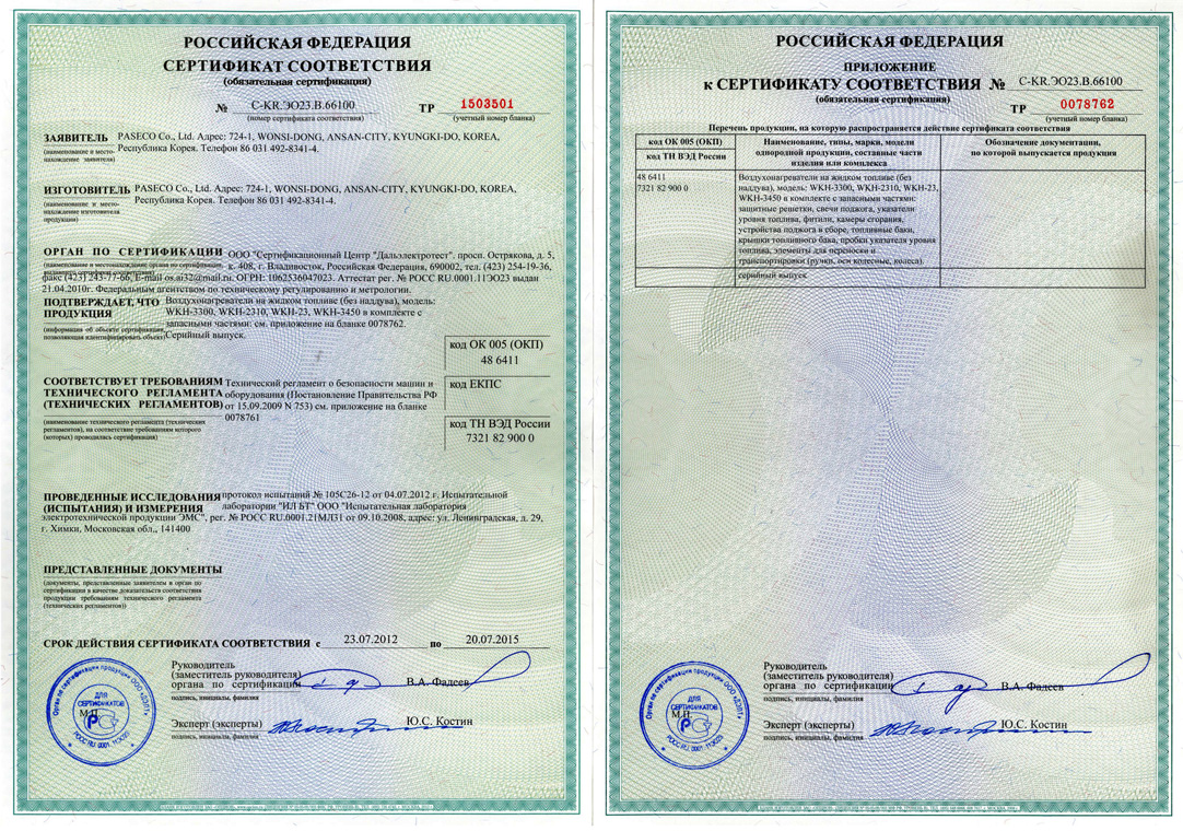 Сертификат соответствия на керосиновый обогреватель Kerona